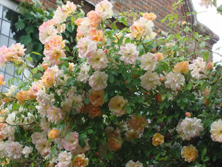 ‘Phyllis Bide’, moreover, could be the pin-up of almost any week. This is how she starts; a profusion of warm colours hard to name precisely, starting close to orange and fading to pinky-white, covering a wall nine or ten feet high. Later she is more spasmodic but incredibly constant in flower, keeping going in reasonable conditions till Christmas.